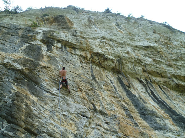 Alex dans une des nouvelles voies équipées par Julien "Qui s'y jette s'y pique" 7b+